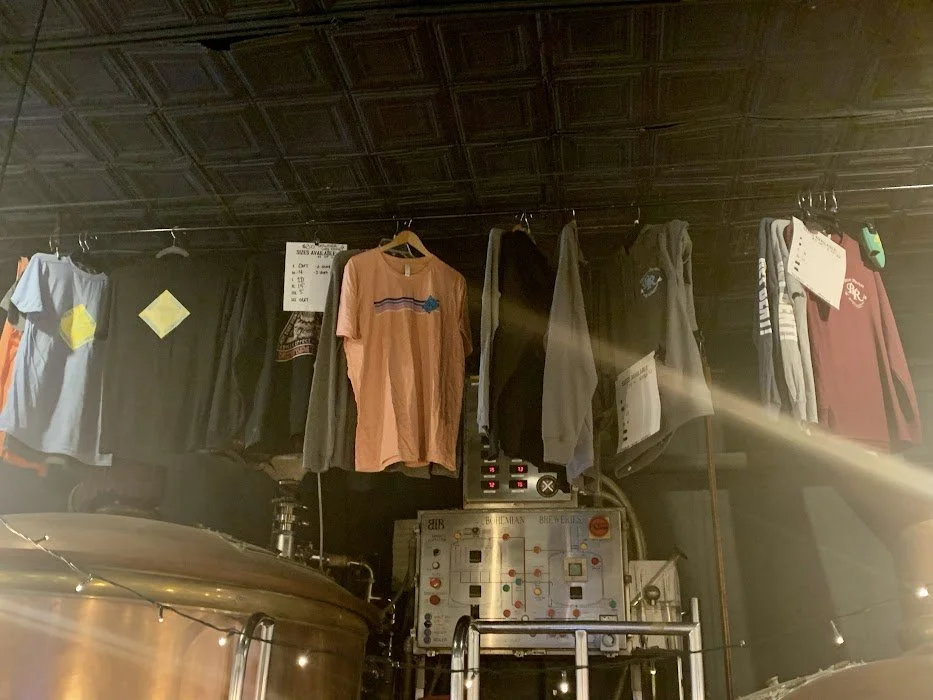 The beer is what brought us in the door, but Bent River also has a full and robust food menu featuring nachos, wings, burgers, and sandwiches. No matter what you order, you must try the spicy ketchup made by one of the bartenders (he has his own company, Ground Pounder Hot Sauces)! Bent River doesn’t have much space to display its merchandise, so they hang it up off of the ceiling above the bar. They offer several shirt choices in both long and short sleeves, as well as a bar sign. This is in addition to a full lineup of to-go beer, which we took advantage of to share with others back in Kansas.