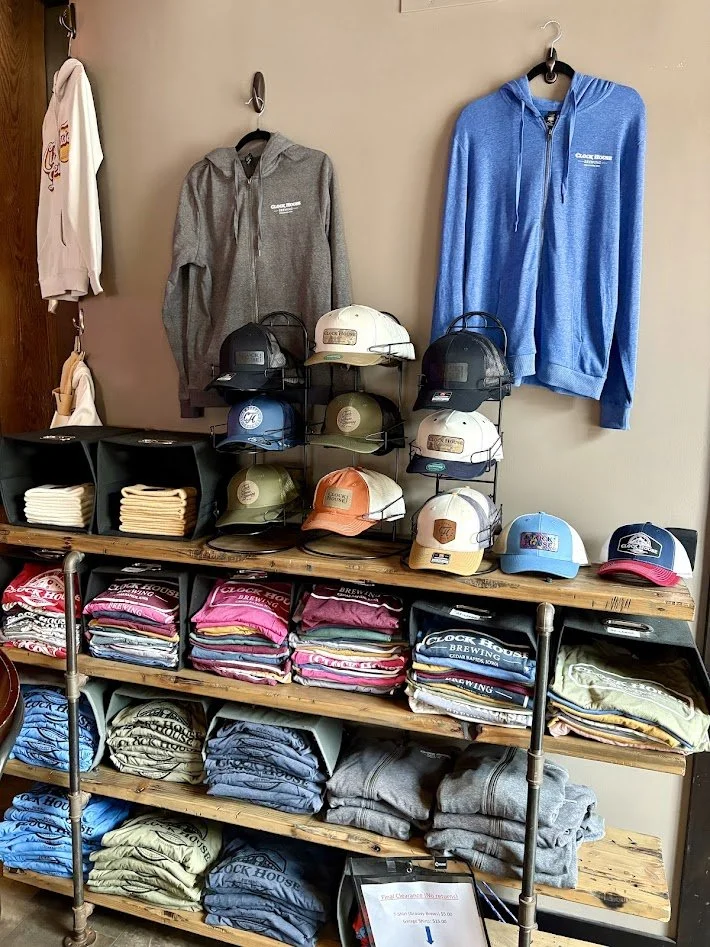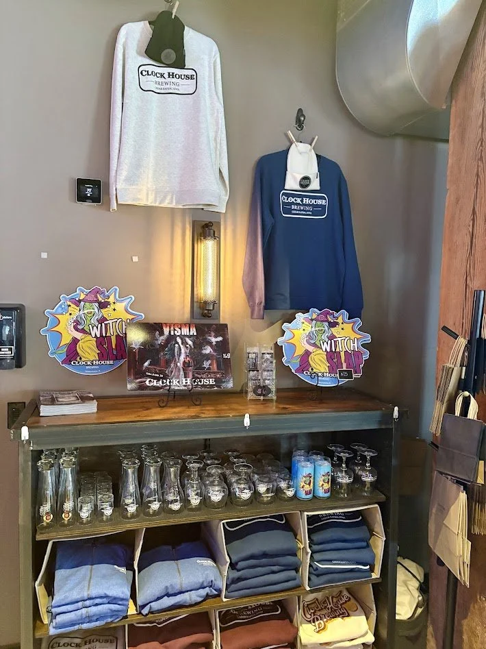 Clock House shares a kitchen with the business next door, which provides ample appetizers to choose from such as soft pretzels, mozzarella sticks, or wings, as well as burgers or sandwiches for a bigger meal. While we didn’t sample anything during this visit, things sure smelled good! Beer is their staple drink option, but they do also serve hard cider and wine. For a place of this size, their merchandise section is quite robust. There is an entire wall featuring many of their t-shirts, sweatshirts, and hats, as well as tons of glassware and even a few wall tackers of their most popular brews.