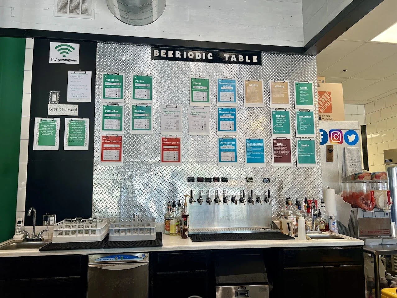During our visit, ExBEERiment had 9 different beers to choose from. We were told that they are in a transition on what is typically on tap, but this trip featured 5 IPAs, a sour, a red lager, a Helles, and a cream ale. Their beers are all displayed on the back wall menu as if they were an element in the periodic table (AKA, the “Beeriodic Table”). Each beer was assigned a letter(s) that corresponds with an element! Different beers on the board were featured in different colored squares and, after asking what that meant, we were told it correlates with their batch: green is a large batch brew, white is a small batch, and red is the brewer’s specialty personal batch. Sticking with the science theme, they actually name most of their beers along those lines - like the Photon (IPA) and Reaction (sour). If you wish to order a flight, those would be served in 5-oz test beakers!