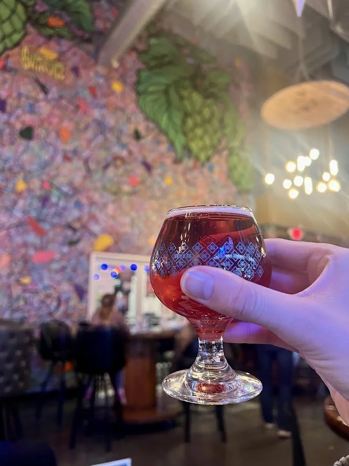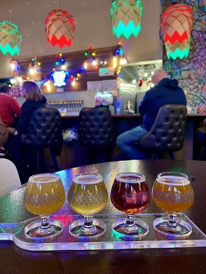 With limited time to visit, we opted for a flight that included four, 5-ounce pours, and featured beautiful color variation. We started with the Fairy Nectar IPA, their signature brew and known flagship, followed by the Cabana Crusher Orange Wheat (their take on a Blue Moon). A unique try was the Koala Tears, an incredibly sour brew that was described by the brewtender as an “Arnold Palmer” of sorts. Though these three weren’t favorites for us, we appreciated the diversity in the flavor palette. The best brew of the trip was actually a seasonal rotator, the Inflatable Snowman. This holiday lager featured notes of cinnamon and was jolly red in color to boot.
