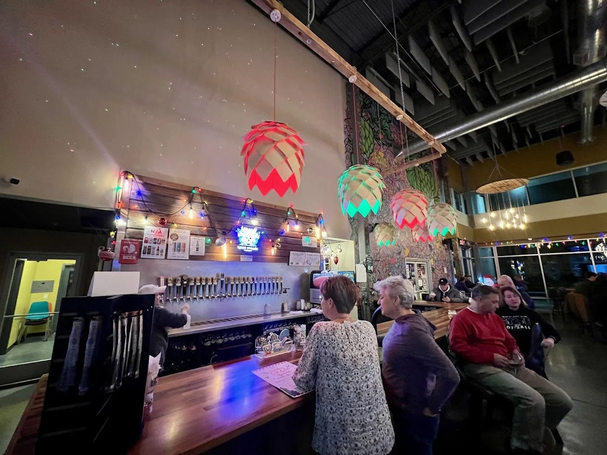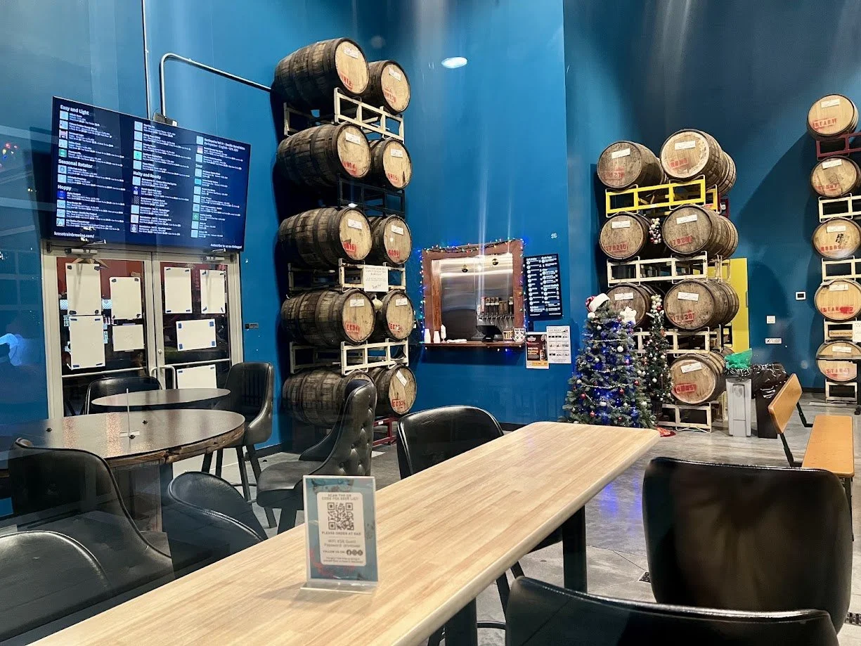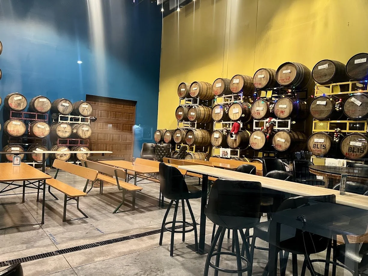 Located in a strip shopping area, Kros Strain is located alongside a variety of local businesses and even one other brewery (that we hope to try next time). The giant outdoor patio and large windows that showcase countless barrels used for their barrel-aged brews make this place tough to miss. With our visit nearing the holidays, it was fun to see the festive decorations that also lit the way.
