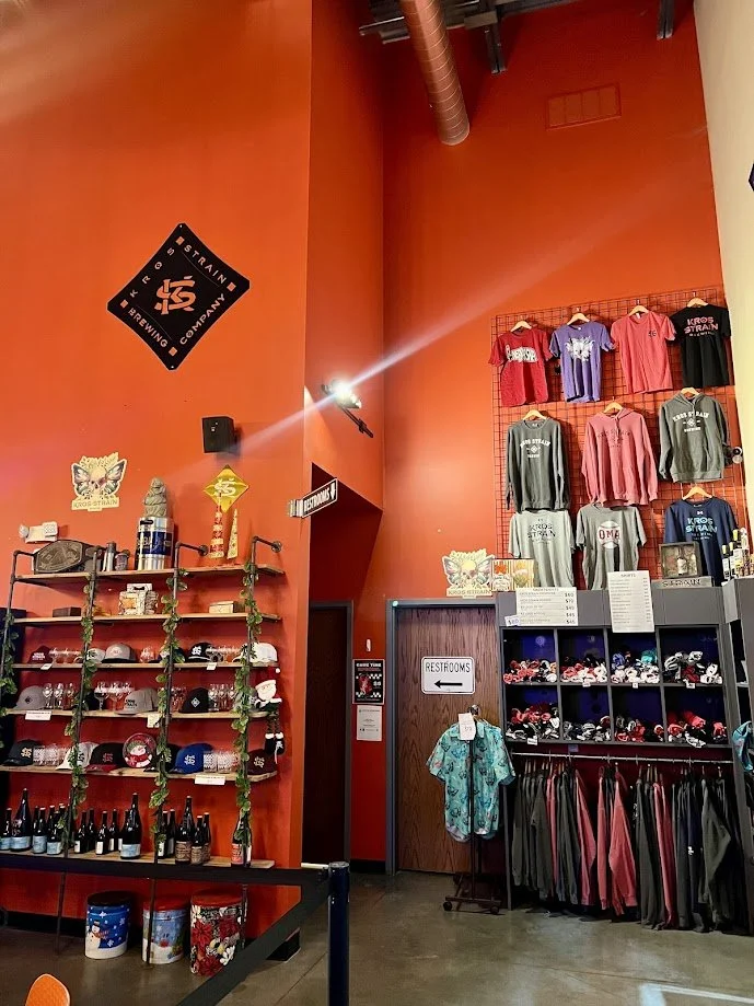 The merchandise section is where Kros Strain really stands out. The variety and sheer number of items available were uncanny in the best way. Whether you want glassware, hats, beanies, shirts, sweatshirts, Hawaiian shirts, flannels, dog collars/leashes, bandanas, koozies, stickers, or tap handles - they’ve got you covered! They also feature a large selection of both bottled and canned beer available for to-go purchase.