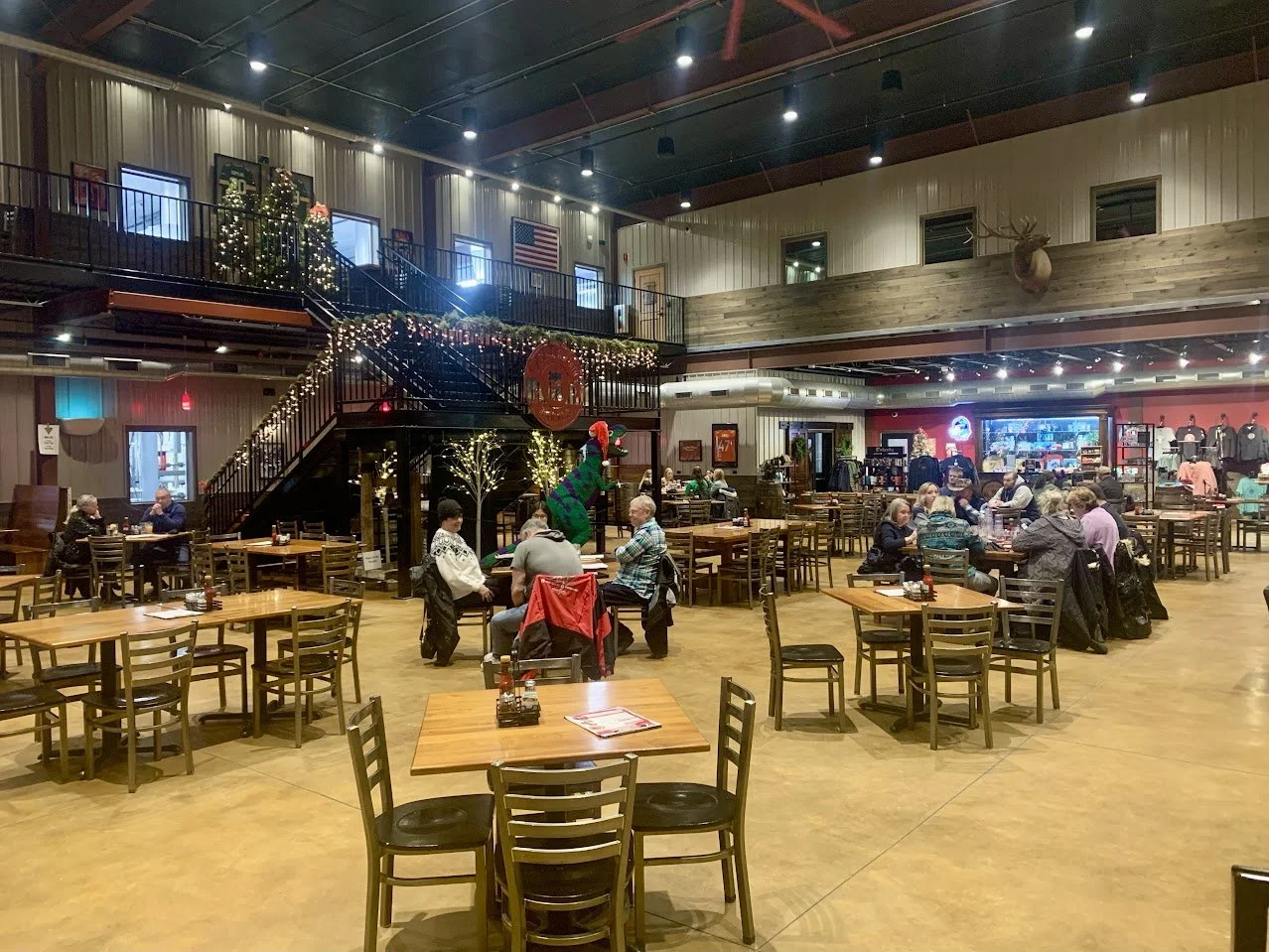 The indoor space feels gigantic featuring ceilings close to 30 foot tall, a large staircase occupying the middle of the room leading to the reservable second floor, and a huge, stone fireplace to warm the cozy space. They have large taxidermy deer and elk on the walls that are almost dwarfed by the size of everything around them. The room features a bar at one end and tables, chairs, and couches spread about the remaining space - but our favorite feature is the 6-foot tall T-Rex made entirely out of Legos sitting at the base of the stairs!